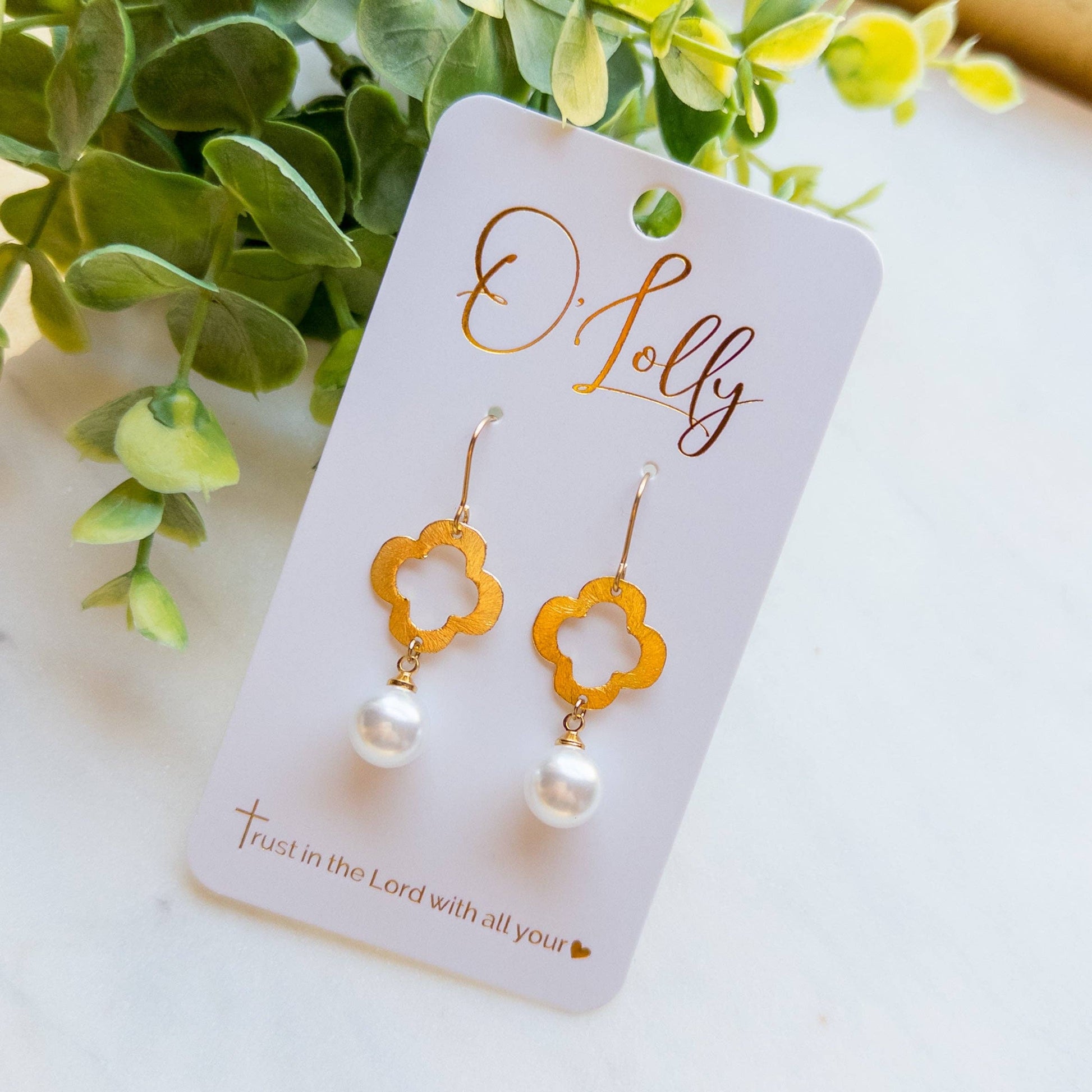 Gold Open Quatrefoil w/Pearl Dangle- “Terra”