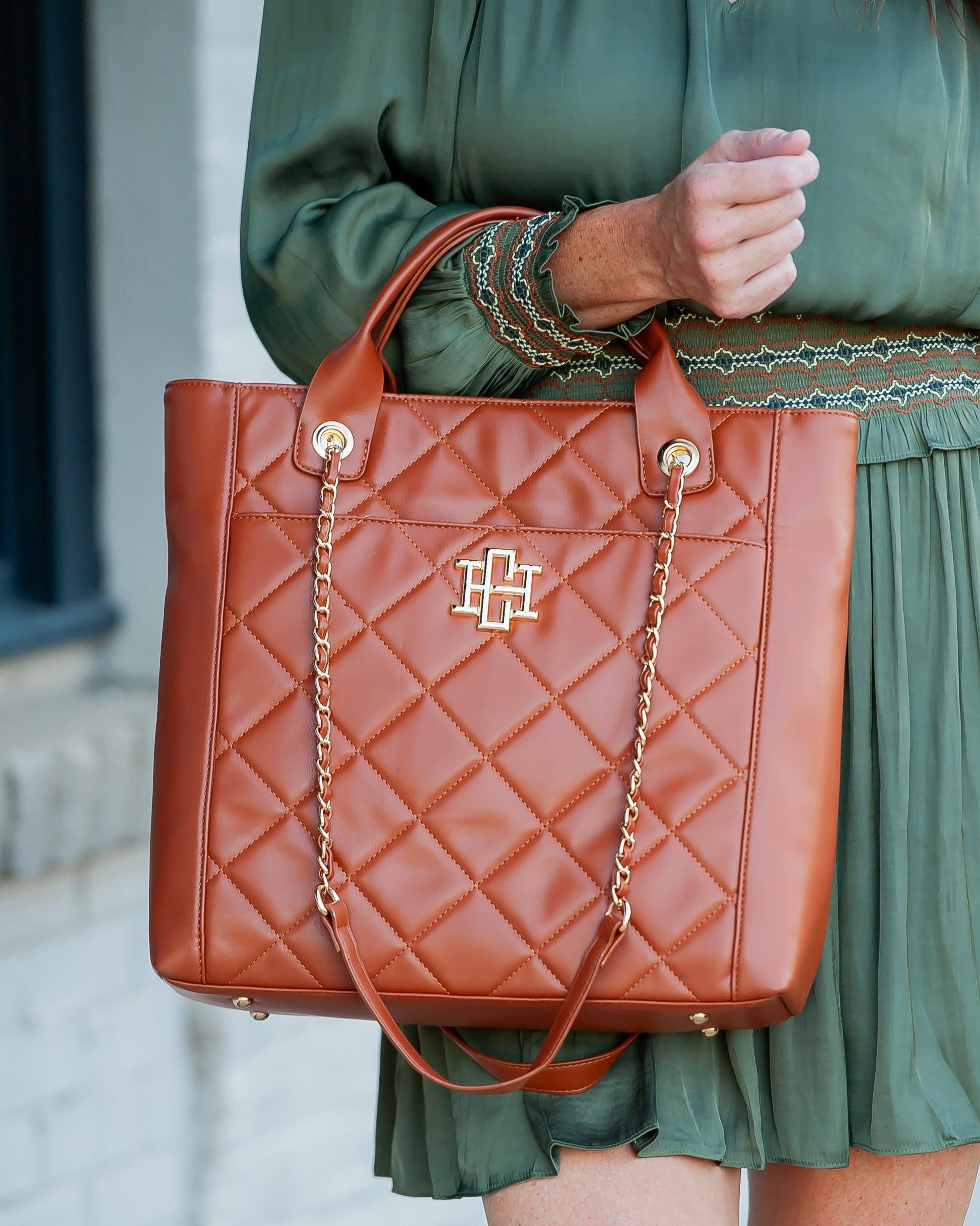 This tall magazine style tote is designed with a stunning vegan leather quilted fabric. It's a great, everyday bag that accommodates most laptops with plenty of space for daily essentials. It features a deep magnetic front pocket ideal for a large phone, along with versatile carrying options through short top handles and elongated braided handles. This tote includes a secure magnetic closure, along with two interior open pockets and one zippered pocket for efficient organization. There are feet on the bottom for added protection as well.